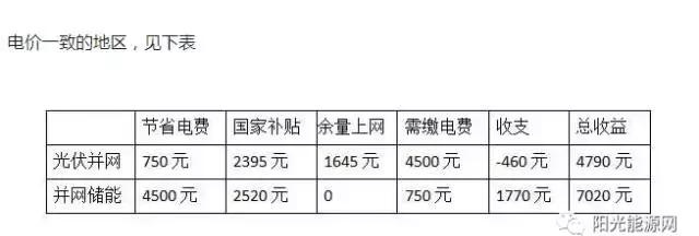 舉個例子來說,在南方一套5KW光伏發(fā)電系統(tǒng),每年發(fā)電約6000度,每年會停電120小時左右,約損失300度電。自用電電價是0.75元/度,大部分在晚上,光伏發(fā)電余量上網(wǎng),除去稅電價約0.35元/度,兩者每度電有0.4元的價差。用戶每年用電約7000度,如果沒有安裝光伏發(fā)電,每年需要繳付5250元的電費;安裝光伏后,國家補貼0.42元/度,白天光伏用電很少,大部分都是余量上網(wǎng)賣給電網(wǎng),晚上用電還是需要繳付電費;安裝光伏儲能系統(tǒng)后,在停電期間也可以正常發(fā)電,每年6000度全部自發(fā)自用,可節(jié)省電費4500元,我們來對比一下兩種方案客戶的收益: