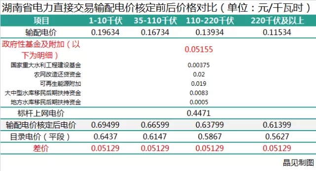 湖南省發(fā)改委于2017年1月1日便開始執(zhí)行輸配電價核定后的銷售電價。晶見計算得出,如果依據(jù)湖南省發(fā)改委關(guān)于省電網(wǎng)2017-2019年輸配電價有關(guān)問題中通知及其附件內(nèi)提到的“參與電力市場的用戶購電價格由市場交易價格、輸配電價(含線損和交叉補貼)和政府性基金組成;未參與電力市場的用戶,執(zhí)行政府規(guī)定的電價”,參與直接交易的電力用戶或者售電公司就需要繳納比目錄電價更高昂的電費,差價將達到5.1分。