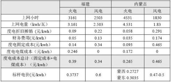 表4:福建、內(nèi)蒙新投產(chǎn)火電、風(fēng)電機(jī)組度電成本比較