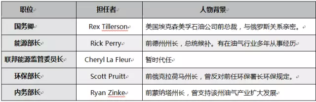 特朗普政府的能源環(huán)保政府機(jī)構(gòu)的要職人物多是石油天然氣傳統(tǒng)化石能源有著從事多年的豐富經(jīng)驗(yàn)。未來美國本國石油天然氣產(chǎn)業(yè)會(huì)得到大力的政策支持,而針對(duì)碳減排環(huán)保的政策會(huì)有所放寬。