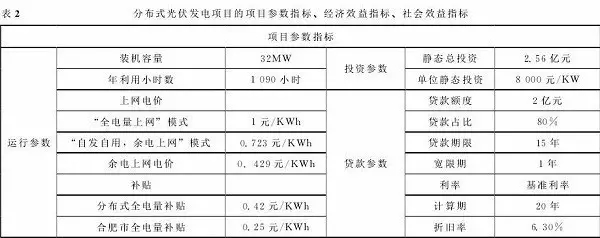 項目所在工業(yè)園區(qū)成立了園區(qū)分布式光伏示范項目的開發(fā)協(xié)調(diào)機構(gòu)(園區(qū)管委會),負(fù)責(zé)協(xié)調(diào)發(fā)電企業(yè)與園區(qū)用能企業(yè)簽訂屋頂協(xié)議與合同能源管理協(xié)議,與園區(qū)所屬電網(wǎng)公司簽訂余電上網(wǎng)收購協(xié)議。在此模式下,業(yè)主獲得電費與補貼收入,用電企業(yè)享受優(yōu)惠電價與節(jié)能效益,園區(qū)管委會負(fù)責(zé)協(xié)調(diào)屋頂與并網(wǎng)接洽并收取少量手續(xù)費,促進協(xié)議的簽訂和項目的正常運營,實現(xiàn)了多方共贏。本項目業(yè)主方集開發(fā)商、設(shè)備供應(yīng)商、EPC承包商為一體,有利于發(fā)揮組織與協(xié)調(diào)優(yōu)勢,減少商業(yè)與操作風(fēng)險,在簡化商業(yè)模式的同時,促進光伏電池組件、逆變器等設(shè)備的消納,形成多方互惠共贏的商業(yè)化運作模式。表2列出了分布式光伏發(fā)電項目的項目參數(shù)指標(biāo)、經(jīng)濟效益指標(biāo)和社會效益指標(biāo)。