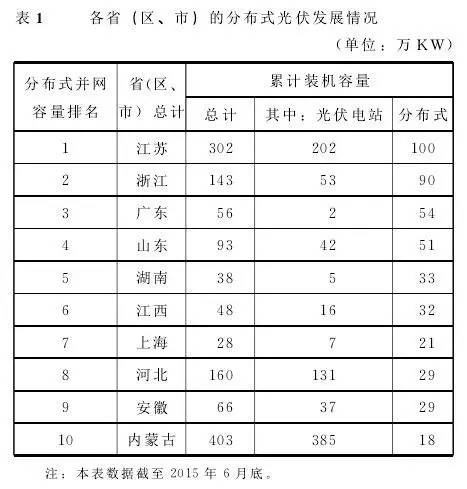 從國際發(fā)展水平看,中國由于電網(wǎng)特點與開發(fā)條件,分布式光伏處在探索與發(fā)展階段,與全球發(fā)達國家相比仍存在差距。目前,發(fā)展較快的省份主要集中在中、東部地區(qū),排名前五位的省份是江蘇(100萬KW)、浙江(90萬KW)、廣東(54萬KW)、山東(51萬KW)和湖南(33萬KW)。中國的分布式光伏發(fā)展以“金太陽”工程和工業(yè)園區(qū)項目為主,住宅項目也在逐漸興起。各省份的分布式光伏的發(fā)展情況如表1所示。
