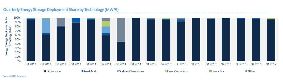 根據(jù)發(fā)布的數(shù)據(jù)顯示,鋰離子電池仍占據(jù)儲(chǔ)能市場(chǎng)的主流地位,占2017年1季度儲(chǔ)能市場(chǎng)的96.5%,在用戶側(cè)儲(chǔ)能市場(chǎng)亦是占據(jù)主導(dǎo)地位。