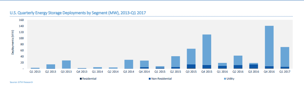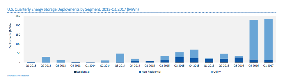 2017年1季度,美國(guó)儲(chǔ)能安裝達(dá)到233.7MWh,環(huán)比增長(zhǎng)2%,同比增長(zhǎng)944%,創(chuàng)下美國(guó)歷年來(lái)季度安裝量之最。