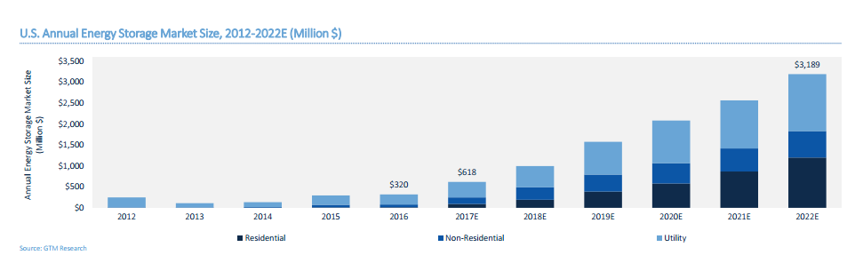 2017年,美國(guó)儲(chǔ)能市場(chǎng)收益增長(zhǎng)幾乎是2016年的2倍。其中,住宅用儲(chǔ)能市場(chǎng)收益激增650%,公共事業(yè)單位的儲(chǔ)能市場(chǎng)收益增長(zhǎng)將是歷年來(lái)最高,達(dá)到1.28億美元。