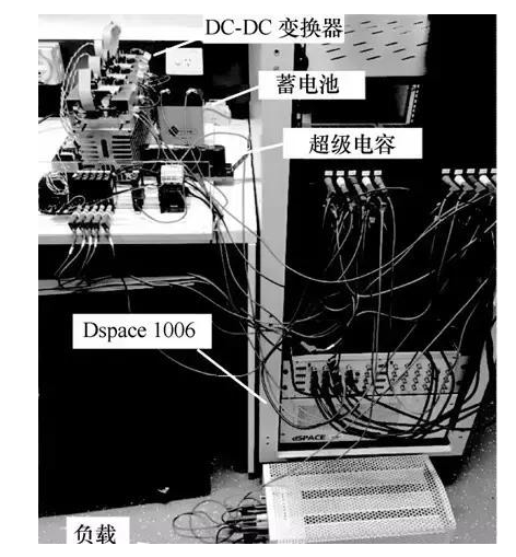 為對(duì)理論分析結(jié)果進(jìn)行實(shí)驗(yàn)驗(yàn)證,本文搭建了含有蓄電池/超級(jí)電容混合儲(chǔ)能系統(tǒng)的直流微網(wǎng)實(shí)驗(yàn)平臺(tái),如圖8所示。LiFePO4電池、超級(jí)電容作為混合儲(chǔ)能系統(tǒng)的電源輸入,經(jīng)過雙向Boost DC- DC雙向變換器接入直流母線,為電阻負(fù)載Rload提供電能。