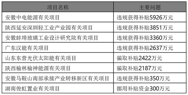 2013年6月,審計署公布《5044個能源節(jié)約利用、可再生能源和資源綜合利用項目審計結(jié)果》,其中8個違規(guī)使用資金的金太陽工程項目被查處,違規(guī)方式主要包括:編造虛假申報材料,套取、騙取資金;擠占、挪用資金用于生產(chǎn)經(jīng)營、業(yè)務(wù)經(jīng)費等支出;以“報大建小”、重復(fù)申報等方式違規(guī)獲得資金等。8個項目合計涉及違規(guī)補貼金額2.1億元。占參與抽查的金太陽工程項目資金總規(guī)模的2.58%,8個項目總規(guī)模64.298兆瓦,占被抽查總裝機規(guī)模的29%。