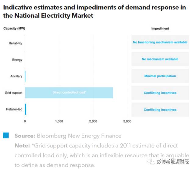 需求響應(yīng)在澳大利亞國(guó)家電力市場(chǎng)(NEM)中面臨的主要阻礙在于難以進(jìn)入電力批發(fā)市場(chǎng),而各大電廠的供電刺激措施也互相矛盾。NEM缺乏其它市場(chǎng)中需求響應(yīng)資源廣泛存在所須具備的兩大關(guān)鍵因素:容量電費(fèi)或可用性費(fèi)用以及第三方電力集成商的參與。而NEM目前只針對(duì)不可調(diào)度的需求響應(yīng)的參與提供刺激措施,但這一做法并無(wú)多大意義。