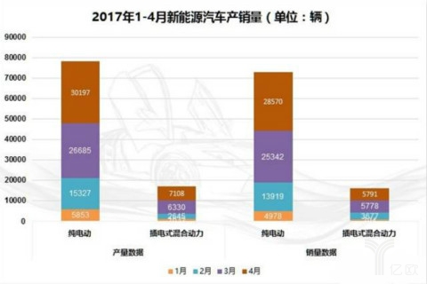 2017年前四個月,中國新能源汽車銷量90402,同比下降0.2%。其中,純電動車銷量為72895輛,同比增長9.7%;插電式混合動力車銷量為17507輛,同比下降27.4%。