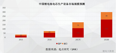 根據(jù)起點研究(SPIR)統(tǒng)計,2016年中國鋰電池電芯設(shè)備規(guī)模為75億元,同比增長超過100% 。其中國產(chǎn)設(shè)備占55億元。