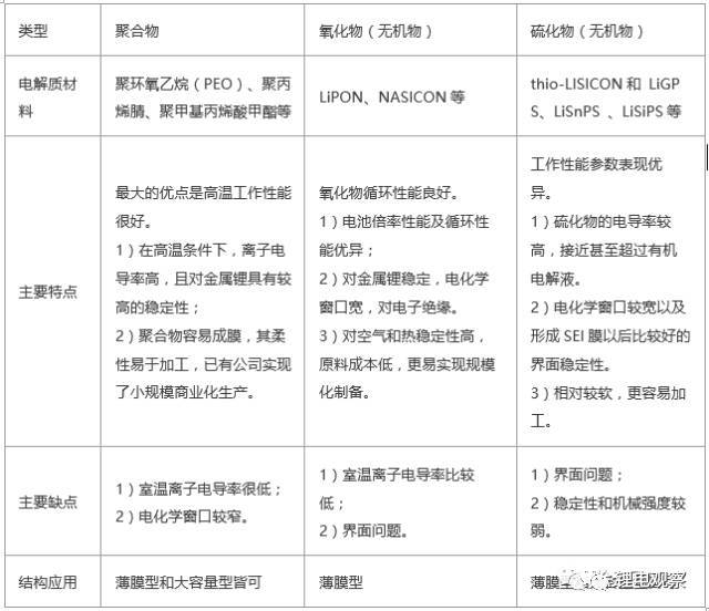 根據(jù)固態(tài)電解質(zhì)材料類別,可以分為聚合物全固態(tài)鋰電池和無機物全固態(tài)鋰電池,不同類型的電解質(zhì)其性能具有較大的差異(可見下表2),根據(jù)結(jié)構(gòu)設(shè)計的差別,全固態(tài)鋰電池又可分為薄膜型和大容量型。