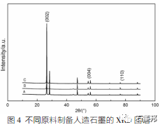 圖4是不同原料、相同制備工藝制成的三種人造石墨A、B、C的XRD圖譜,由圖4可知:A、B、C三種材料的主峰位置基本相同,均位于26°2θ角附近,說(shuō)明經(jīng)過(guò)高溫石墨化處理后的A、B、C三種材料形成了石墨晶體的六方晶型結(jié)構(gòu)。
