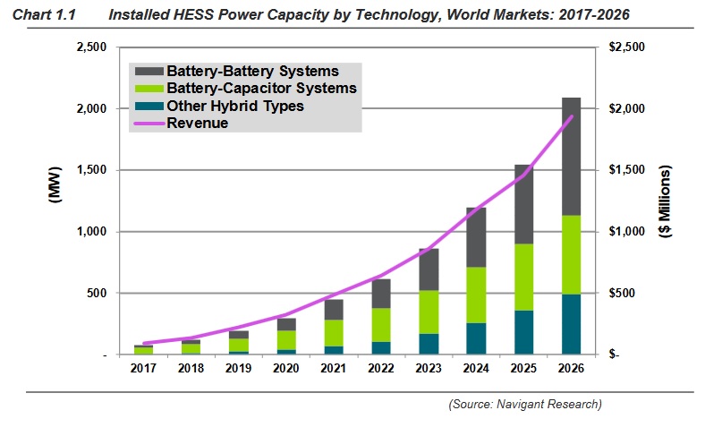 Navigant把混合系統(tǒng)定義為結(jié)合兩種及以上的互補(bǔ)操作特性的儲(chǔ)能技術(shù)的穩(wěn)定儲(chǔ)能系統(tǒng)。大多數(shù)電池系統(tǒng)是設(shè)計(jì)用于提供大功率的短脈沖,或是適應(yīng)能源密集型應(yīng)用。在應(yīng)用中使用并非最適合的儲(chǔ)能技術(shù)會(huì)導(dǎo)致效能退化和成本影響,這將最終導(dǎo)致電池充放電的安全問(wèn)題。