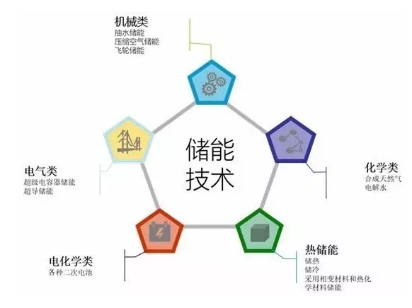 電能儲(chǔ)存技術(shù)分為五大類:機(jī)械儲(chǔ)能、電氣類儲(chǔ)能技術(shù)、電化學(xué)類儲(chǔ)能技術(shù)、熱儲(chǔ)能技術(shù)以及化學(xué)類儲(chǔ)能技術(shù)。在實(shí)際使用中,電能儲(chǔ)存容量占比最高的是抽水蓄能,其次是壓縮空氣儲(chǔ)能和鈉硫電池。