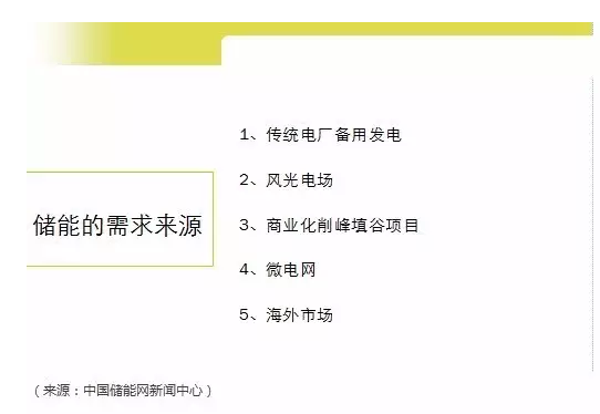 儲(chǔ)能聯(lián)盟發(fā)布了《儲(chǔ)能產(chǎn)業(yè)研究白皮書2017》,提到到 2020 年底,預(yù)計(jì)中國(guó)儲(chǔ)能技術(shù)總裝機(jī)規(guī)模將達(dá)到44GW。儲(chǔ)能的需求來源主要包括傳統(tǒng)電廠備用發(fā)電、風(fēng)光電場(chǎng)、商業(yè)化削峰填谷項(xiàng)目、微電網(wǎng)和海外市場(chǎng)等。