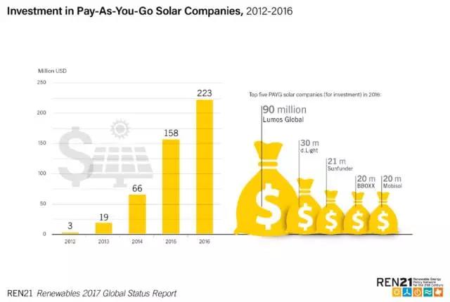 在發(fā)展中國家,無論是微網(wǎng)還是獨(dú)立系統(tǒng)市場都在快速發(fā)展。由移動(dòng)技術(shù)作為支持的隨收隨付(Pay-As-You-Go, PAYG)商業(yè)模式也十分活躍。市場對這一領(lǐng)域的投資迅速從2012年的300萬美元上升至2.23億美元。目前,微網(wǎng)市場每年的增長都超過2000億美元。2016年,僅在風(fēng)電和光伏領(lǐng)域就啟動(dòng)了超過23MW的微網(wǎng)項(xiàng)目。