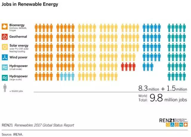 投資的增長帶來了更多的就業(yè)崗位。截至2016年全球范圍內(nèi)共有980萬人從事同可再生能源有關(guān)的工作。可再生能源不僅能解決化石能源領(lǐng)域的失業(yè)難題,同時(shí)也會(huì)成為全球經(jīng)濟(jì)的主要驅(qū)動(dòng)力。