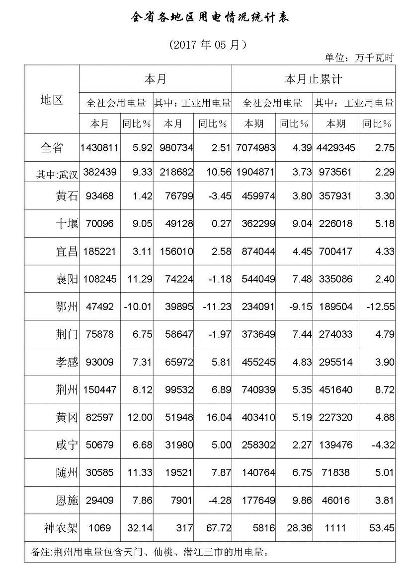 (五)全省各地用電普遍增長,僅鄂州1地因鋼鐵行業(yè)去產(chǎn)能用電下降。5月份全省14個用電統(tǒng)計地區(qū)中,武漢、襄陽等13地全社會用電不同程度增長,其中襄陽、黃岡、隨州3地全社會用電增幅在兩位數(shù)以上,僅鄂州1地全社會用電下降。省會城市武漢當(dāng)月全社會用電38.24億千瓦時,增長9.33%,其中工業(yè)用電21.87億千瓦時,增長10.56%,增幅均遠超全省平均水平,領(lǐng)頭羊地位鞏固。鄂州市強力淘汰鋼鐵行業(yè)落后產(chǎn)能,由此該地當(dāng)月全社會和工業(yè)用電出現(xiàn)較大降幅。