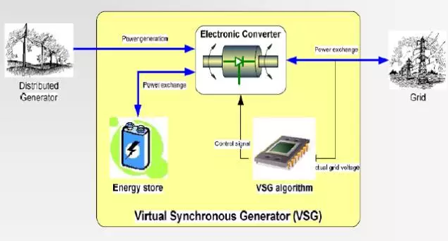虛擬同步機(jī)(VSG)控制是一種基于同步發(fā)電機(jī)暫態(tài)模型的新型微電網(wǎng)逆變電源控制方法,借鑒同步發(fā)電控制中調(diào)速器和勵(lì)磁調(diào)節(jié)器的控制方法來設(shè)計(jì)變流器的控制器,使微源的輸出特性類似一個(gè)同步發(fā)電機(jī)系統(tǒng),對(duì)電力系統(tǒng)具有更加友好的并網(wǎng)特性,便于使用電力系統(tǒng)中成熟的方法對(duì)微源進(jìn)行管理調(diào)度,同時(shí)外特性接近同步機(jī),有利于電力系統(tǒng)的建模分析,避免了現(xiàn)在并網(wǎng)變流器模型多樣給電力系統(tǒng)分析帶來的困難。