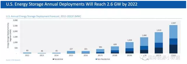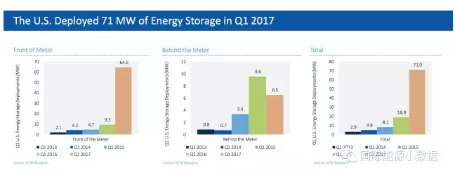 從裝機容量來看,2017年第1季度美國新增71兆瓦,其中新增“電表前”(供應(yīng)側(cè))容量64.5兆瓦,新增“電表后”(需求側(cè))容量6.5兆瓦。GTM公司預(yù)測,2022年美國新增儲能容量將達(dá)2.6吉瓦,其中超過50%將是“電表后”的需求側(cè)儲能應(yīng)用。