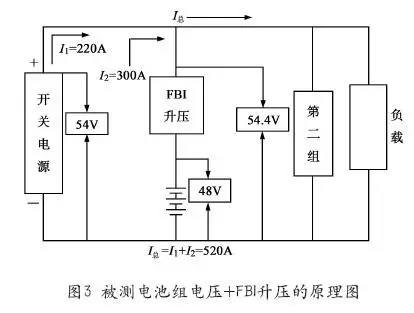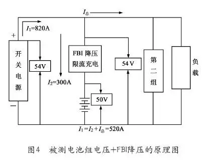 所謂“蓄電池組全在線容量試驗”,是指在被測電池組和通信設(shè)備工作電源之間串聯(lián)一套“電池組全在線放電安全節(jié)能維護(hù)系統(tǒng)FBI”,讓被測電池組相對另一組處于浮充狀態(tài)的電池組具有略高電位的趨勢,并通過FBI系統(tǒng)的控制以使被測電池組能夠以恒定電流或恒定功率對在線負(fù)載設(shè)備進(jìn)行供電,隨著被測電池組電壓的下降,FBI系統(tǒng)自動實時升壓補(bǔ)償,以保持被測電池組所在支路電壓(被測電池組電壓+FBI升壓)始終保持與另一組電池等電位,但始終具有略高電位的趨勢,以使被測電池組能夠持續(xù)在線供電,當(dāng)被測電池組以恒定電流或恒定功率在線放電到預(yù)先設(shè)定的截止電壓后,FBI系統(tǒng)自動引導(dǎo)整流器在線對被測電池組充電恢復(fù),隨著被測電池組電壓的上升,FBI系統(tǒng)自動隨時降壓補(bǔ)償,以保持被測電池組所在支路電壓(被測電池組電壓+FBI升壓)始終保持與另一組電池等電位,直至被測電池組充電恢復(fù)完成。在此被測電池組全在線放電和充電過程中,另一組電池始終保持浮充狀態(tài)。采用FBI,徹底改變了以往蓄電池放電容量測試模式,解決了離線式測量法和在線式測量法的種種弊端。被測電池組電壓+FBI升壓的原理圖如圖3所示。當(dāng)然也可以采用被測電池組電壓+FBI降壓的模式。被測電池組電壓+FBI降壓的原理圖如圖4所示。