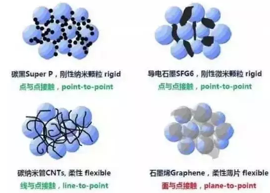 作為鋰離子電池導(dǎo)電劑材料使用的主要有常規(guī)導(dǎo)電劑SUPER-P、KS-6、導(dǎo)電石墨、碳納米管、石墨烯、碳纖維VGCF等,這些導(dǎo)電劑擁有各自的優(yōu)劣勢(shì)。具體來(lái)看: