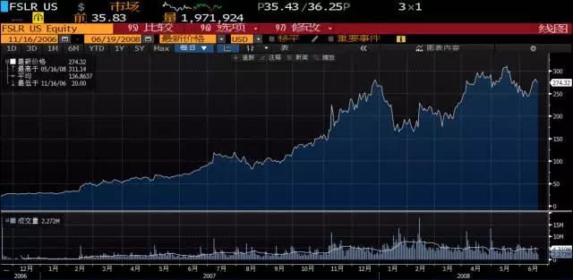 在光伏剛剛出來的時候,資本市場對光伏企業(yè)是極度的狂熱。在2005-2007年,兩年的時間里,那時候光伏組件的龍頭,F(xiàn)irst Solar的漲幅超過13倍,市值約為200億美金,而2007年,F(xiàn)irst Solar的銷售額僅為5億美金,盈利為1.6億美金,對應PS為40倍,PE為125倍。