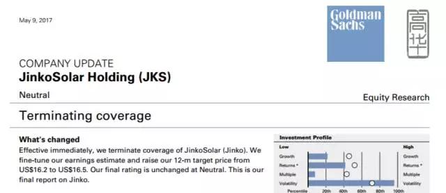 比如,高盛在2017年5月就終止覆蓋目前全世界最大的光伏組件廠商,晶科能源。