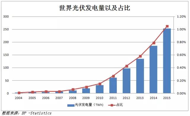 我們回顧光伏的歷史:從2004年到2015年,光伏發(fā)電量從2004年的2.6TWh增長了近100倍,到2015年的253TWh,同時,光伏占全世界的發(fā)電量占比從2004年的0.01%也增長了100倍至2015年的1.05%。