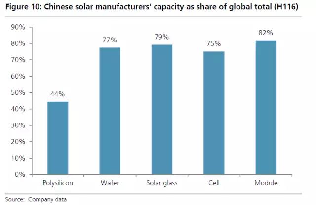 根據(jù)UBS的統(tǒng)計,中國公司在全球多晶硅占44%,硅片占77%,光伏玻璃占79%,電池片占75%,模組82%。