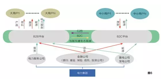 為充分利用互聯(lián)網(wǎng)的零距離、零時差的資源共享優(yōu)勢,在建立中小電力用戶的B2C平臺以及與大用戶之間的B2B平臺后,通過C2B對兩個平臺進行融合,以金融為核心,以供應(yīng)鏈為紐帶,以能源服務(wù)為支持,構(gòu)建融合多產(chǎn)業(yè)的互聯(lián)互通生態(tài)系統(tǒng)。(見圖6)