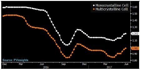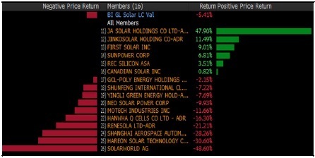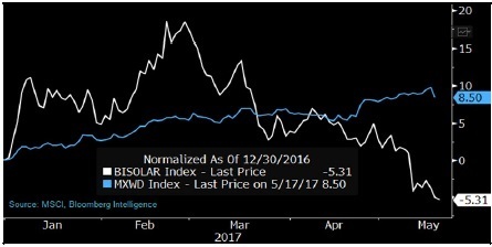 繼2016年大跌52%之后,2017年年初以來(lái),BI 旗下行業(yè)研究的太陽(yáng)能標(biāo)桿企業(yè)相關(guān)股指下跌5%。市場(chǎng)情緒可能已經(jīng)因?yàn)橹忻纼蓢?guó)貿(mào)易關(guān)系緊張(歐盟將對(duì)中國(guó)制造太陽(yáng)能電池板的反傾銷(xiāo)關(guān)稅延長(zhǎng)了18個(gè)月)、國(guó)際油價(jià)下跌、SolarWorld申請(qǐng)破產(chǎn)(2017年年內(nèi)股價(jià)重挫49%)而進(jìn)一步惡化。First Solar和SunPower(2017年股價(jià)分別漲9%和7%)這類美國(guó)太陽(yáng)能企業(yè)削減成本的努力可能緩和市場(chǎng)對(duì)降價(jià)壓力和行業(yè)產(chǎn)能過(guò)剩的擔(dān)憂。