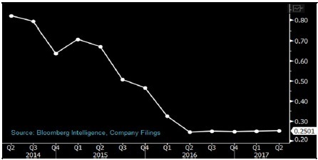 Bloomberg Intelligence 旗下分析的太陽(yáng)能行業(yè)企業(yè) 2017 年業(yè)績(jī)趨勢(shì)圖