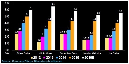 太陽(yáng)能組件生產(chǎn)商在繼續(xù)增加產(chǎn)能,2015年出貨量排名前五的全球五大太陽(yáng)能組件供應(yīng)商今年合計(jì)新增供應(yīng)電量有望達(dá)到7100兆瓦。這新一輪增長(zhǎng)高潮的推手是今年上半年中國(guó)國(guó)內(nèi)強(qiáng)勁的太陽(yáng)能需求,以及在中國(guó)以外地區(qū)供應(yīng)產(chǎn)品以獲得出口美國(guó)免稅的需求。晶科能源的目標(biāo)是挑戰(zhàn)天合光能,奪走后者以額定產(chǎn)能計(jì)最大生產(chǎn)商的地位。天合光能2016年額定產(chǎn)能高達(dá)6500兆瓦。