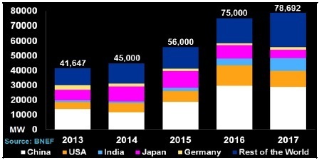 雖然中國(guó)、日本和美國(guó)這三大重要市場(chǎng)的太陽(yáng)能裝機(jī)新增需求增長(zhǎng)停滯,但2017年全球裝機(jī)總需求料將繼續(xù)增加。BNEF預(yù)測(cè),2017年印度、拉美和東南亞可能給全球需求帶來(lái)新的動(dòng)力,總需求將由此增至7.86萬(wàn)兆瓦,超過(guò)2016年7.5萬(wàn)兆瓦的估算需求量。2017年中國(guó)計(jì)劃進(jìn)一步削減新能源補(bǔ)貼,以求降低這類補(bǔ)貼造成的財(cái)政赤字。因此,在2016年達(dá)到創(chuàng)紀(jì)錄新高以后,太陽(yáng)能需求的增速可能受到抑制。