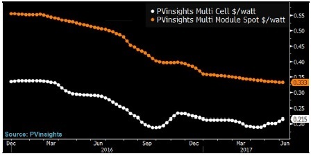 繼2016年下跌35%之后,太陽(yáng)能電池板今年以來(lái)價(jià)格又跌去8%,在供應(yīng)過(guò)剩形勢(shì)惡化的影響下,下半年價(jià)格還會(huì)加速下跌。造成全球產(chǎn)能進(jìn)一步過(guò)剩的部分原因是美國(guó)和歐盟的貿(mào)易保護(hù)立場(chǎng)。太陽(yáng)能報(bào)價(jià)機(jī)構(gòu)PVinsights稱,今年多晶硅太陽(yáng)能電池板平均市場(chǎng)價(jià)格為每瓦0.35美元。降價(jià)趨勢(shì)迫使設(shè)備供應(yīng)商為保住利潤(rùn)而大力削減成本。由此可以預(yù)料,今年下半年競(jìng)爭(zhēng)將更為激烈。