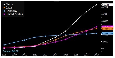 各國(guó)累計(jì)太陽(yáng)能安裝量趨勢(shì)對(duì)比圖(單位:千兆瓦特)