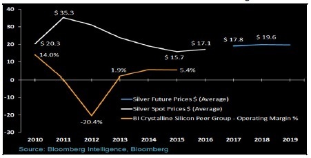 2016年現(xiàn)貨銀價(jià)均價(jià)為每盎司17.13美元,較2015年均價(jià)上漲9%,因此太陽(yáng)能電池制造商2016年的盈利可能縮水。共識(shí)預(yù)期顯示,到2018年,銀價(jià)可能再攀升16%。這可能導(dǎo)致太陽(yáng)能電池制造商的投入成本增加,但到2018年現(xiàn)貨銀價(jià)料將始終低于2012年到2014年的平均水平:每盎司24.90美元。太陽(yáng)能制造商的盈利已經(jīng)與銀價(jià)呈現(xiàn)負(fù)相關(guān)。太陽(yáng)能組件價(jià)格和多晶硅成本對(duì)制造商盈利也很重要。