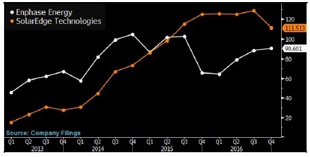 2017年1季度,太陽(yáng)能逆變器供應(yīng)商Enphase推出最新款微型太陽(yáng)能逆變器,集太陽(yáng)能發(fā)電、儲(chǔ)能和家用能源管理系統(tǒng)于一身。其競(jìng)爭(zhēng)對(duì)手SolarEdge正在向歐洲市場(chǎng)推廣類似產(chǎn)品。家用能源管理系統(tǒng)給逆變器供應(yīng)商帶來(lái)了售后服務(wù)的商機(jī),比如提高能源效率的服務(wù)、監(jiān)控以及保養(yǎng)設(shè)備。逆變器供應(yīng)商還可能開(kāi)發(fā)新的銷(xiāo)售商機(jī),以滿足市場(chǎng)需求和電網(wǎng)的服務(wù),比如儲(chǔ)能集群產(chǎn)品。