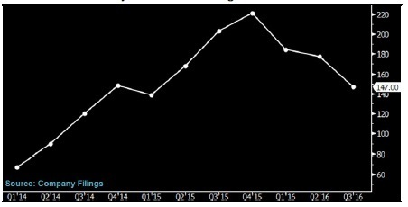 BI 旗下行業(yè)研究的全球太陽(yáng)能標(biāo)桿企業(yè)市銷(xiāo)率中值由2015年第四季度的0.47倍降至0.25倍,這主要源于相關(guān)企業(yè)股價(jià)暴跌54%。在去年6月底開(kāi)始盛傳中國(guó)政府削減新能源補(bǔ)貼以前,這些標(biāo)桿企業(yè)的營(yíng)業(yè)收入去年上半年曾大幅增長(zhǎng)。中國(guó)減少補(bǔ)貼幫助市場(chǎng)消化了設(shè)備供應(yīng)商過(guò)剩的一些供應(yīng)量。而由于預(yù)期全球需求增長(zhǎng)放緩,產(chǎn)能會(huì)再度回升,市場(chǎng)已經(jīng)更加擔(dān)憂2017年的產(chǎn)品降價(jià)和生產(chǎn)商利潤(rùn)縮水。