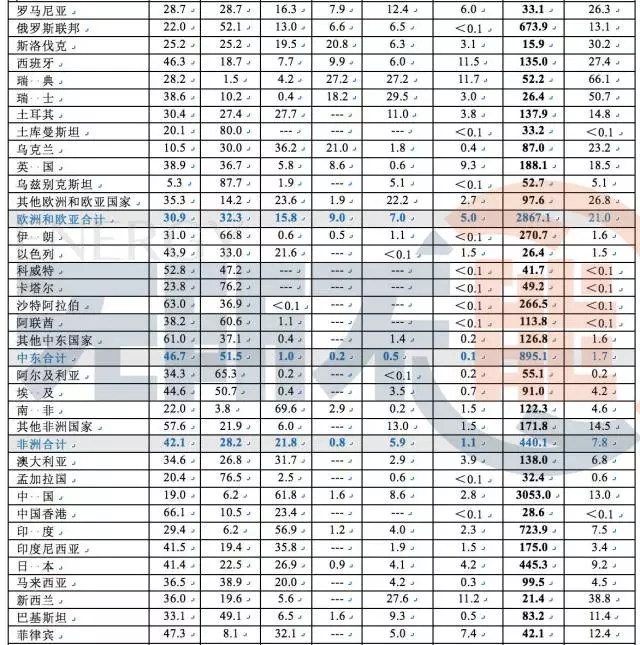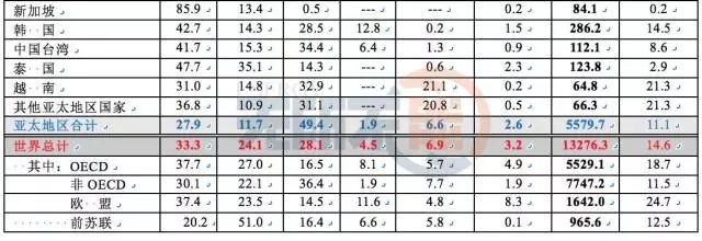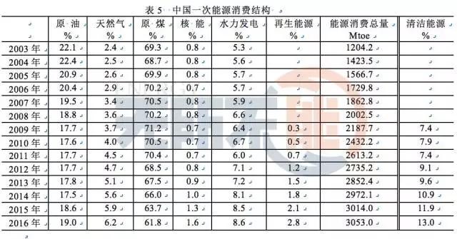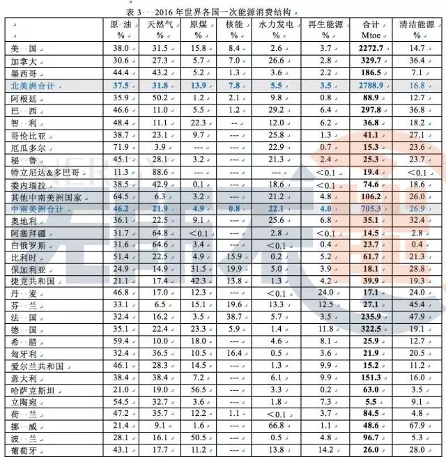 一次能源消費結構是指原油、原煤、天然氣、核能、水力發(fā)電和再生能源等商品消費量在一個國家或地區(qū)的比例,用百分率%表示。商品消費量可以是本土生產(chǎn)的,也可以是進口的。表中Mtoe 表示百萬噸油當量。