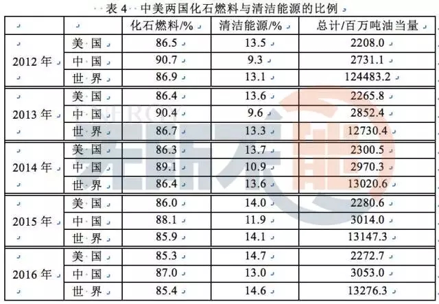 2016年全球清潔能源(核能+水力發(fā)電+再生能源)平均水平為14.6%,中國清潔能源份額為13.0%,比世界平均水平低,也比美國14.7%低,但是中國清潔能源發(fā)展得很快。從2012年至2016年世界平均增加了14.6-13.1=1.5%,中國增加了13.0-9.3=3.7%,而美國增加了14.7-13.5=1.2%。中國能源正在快步走向清潔能源。
