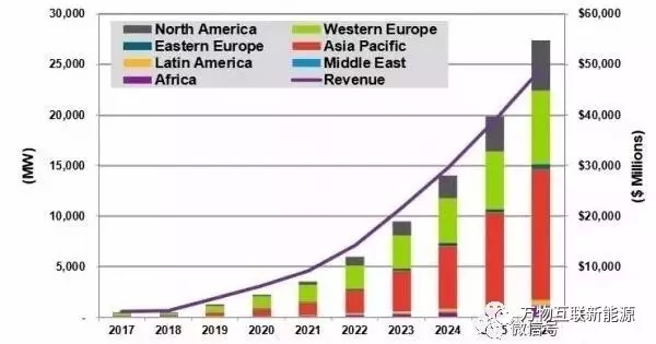 按地區(qū)分類的全球年度分布式、偏遠(yuǎn)及離網(wǎng)太陽能光伏+儲能市場規(guī)模及供應(yīng)商營收,2017-2026年。圖片來源:Navigant市場調(diào)研公司