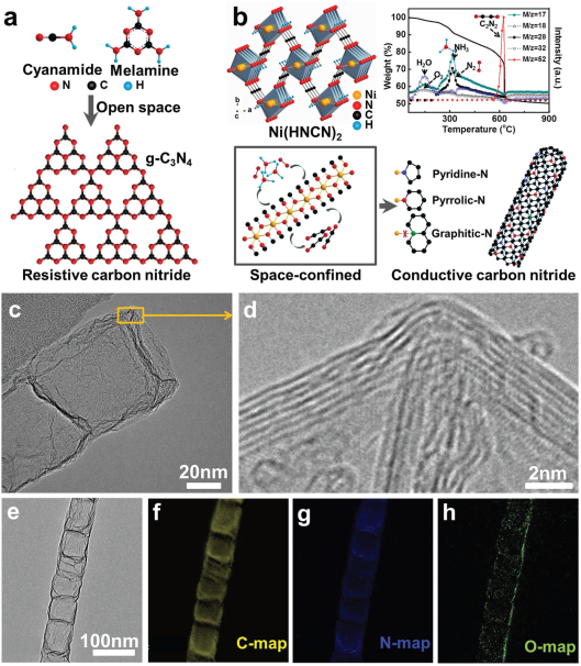 研究人員通過空間限域自催化反應(yīng)設(shè)計(jì),制備出新型的導(dǎo)電碳氮化合物。在空間限域反應(yīng)中,獨(dú)特的氫氰氨鎳前驅(qū)體分解產(chǎn)生金屬鎳作為導(dǎo)電sp2碳生長(zhǎng)的催化劑,以及×N=C=N×或NoC-CoN基團(tuán)作為碳源和氮源。同時(shí),氫氰氨鎳中的Ni-N鍵有利于氮原子的穩(wěn)定存在。高的熱處理溫度可提高導(dǎo)電率,卻會(huì)降低氮含量。因而通過調(diào)節(jié)反應(yīng)溫度,可以進(jìn)一步平衡氮含量和導(dǎo)電率。在800°C條件下,碳sp2雜化程度達(dá)60%從而具有2.3 S cm?1的導(dǎo)電率,氮含量高達(dá)15 at%,尤其是具有電化學(xué)活性的吡啶氮和吡咯氮高達(dá)9 at %和5 at %。這種簡(jiǎn)單易規(guī)?;a(chǎn)的方法極具產(chǎn)業(yè)應(yīng)用價(jià)值,同時(shí)也為設(shè)計(jì)和合成其它新型儲(chǔ)能材料提供了一種新的思路。