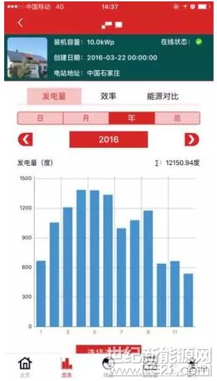 最近來自河北石家莊的居民給晶晶發(fā)來了一張光伏電站的監(jiān)控截圖,從這張截圖我們可知,該光伏電站一共10KW,2016年一共發(fā)電12150.94度,發(fā)電小時數(shù)為1215.09h,符合石家莊市的光照條件及發(fā)電預期。