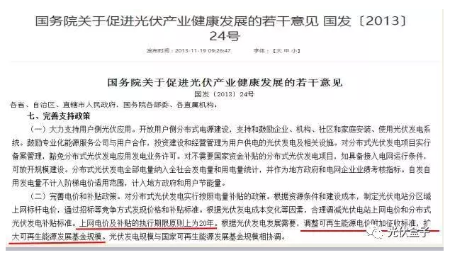 國務(wù)院2013年7月4日發(fā)布的國發(fā)〔2013〕24號(hào)《國務(wù)院關(guān)于促進(jìn)光伏產(chǎn)業(yè)健康發(fā)展的若干意見》。其中第七大條完善支持政策中明確指出:上網(wǎng)電價(jià)及補(bǔ)貼的執(zhí)行期限原則上為20年。