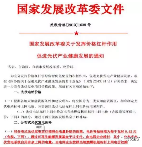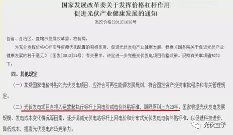 2013年8月26日國家發(fā)改委發(fā)布的發(fā)改價(jià)格〔2013〕1638號(hào)《國家發(fā)展改革委關(guān)于發(fā)揮價(jià)格杠桿作用促進(jìn)光伏產(chǎn)業(yè)健康發(fā)展的通知》。文件第四條明確提出:光伏發(fā)電項(xiàng)目自投入運(yùn)營起執(zhí)行標(biāo)桿上網(wǎng)電價(jià)或電價(jià)補(bǔ)貼標(biāo)準(zhǔn),期限原則上為20年。