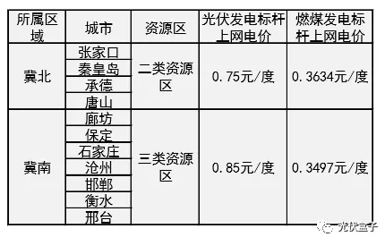 河北省分成了冀南和冀北兩片區(qū)域,其中,在冀北包括承德、張家口、唐山、秦皇島屬于二類資源區(qū)。保定、石家莊、廊坊、滄州、邯鄲、邢臺(tái)屬于冀南,屬于三類資源區(qū)。執(zhí)行的光伏發(fā)電標(biāo)桿上網(wǎng)電價(jià)不同,燃煤發(fā)電上網(wǎng)電價(jià)也不同,具體2017年的價(jià)格如下: