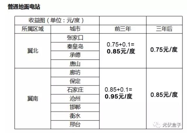 《河北省人民政府關(guān)于進(jìn)一步促進(jìn)光伏產(chǎn)業(yè)健康發(fā)展的指導(dǎo)意見》(冀政[2013]83號(hào))規(guī)定,2014年底建成投產(chǎn)的光伏電站項(xiàng)目,其上網(wǎng)電價(jià)在國家確定的光伏電站標(biāo)桿上網(wǎng)電價(jià)基礎(chǔ)上按照每千瓦補(bǔ)貼0.3元執(zhí)行,2015年底前建成投產(chǎn)的補(bǔ)貼0.2元,2017年底前投產(chǎn)的補(bǔ)貼0.1元,自投產(chǎn)之日起執(zhí)行3年。