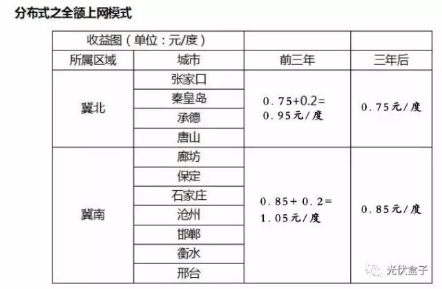 注釋:0.75或0.85為光伏上網(wǎng)標(biāo)桿電價(jià),補(bǔ)貼年限20年;0.1為河北省補(bǔ)貼,補(bǔ)貼年限3年。